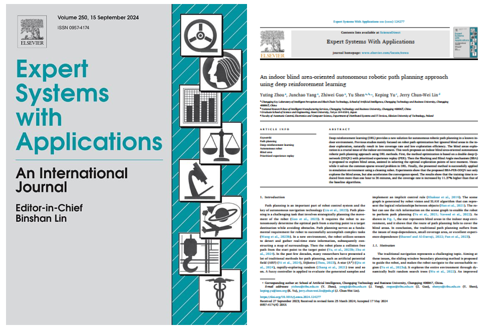 我校人工智能学院硕士研究生周雨婷在机器人自主路线规划方面取得了新进展,研究成果“An Indoor Blind Area-Oriented Autonomous Robotic Path Planning Approach Using Deep Reinforcement Learning”(面向室内盲区基于深度强化学习的机器人自主路径规划方法)在智能系统领域国际知名期刊《Expert Systems With Applications》(中科院1区Top)在线刊出(DOI:10.1016/j.eswa.2024.124277)。
