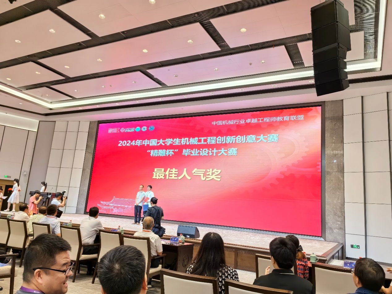 据悉,“精雕杯”毕业设计大赛于2022年被列入“中国大学生机械工程创新创意大赛”并进入全国普通高校学科竞赛排行榜,大赛所具有的导向性、示范性,为高校学生提供了碰撞创新思维、交流实践经验、相互学习促进的平台。我校学子在比赛中获奖展示了学校面向“新工科”改革取得的育人成效。