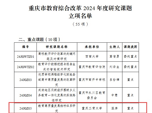 近日,重庆市教育委员会公布《重庆市教育综合改革2024年度研究课题立项名单》,共立项重点项目10项,我校温涛教授牵头的《教育高质量发展指标体系研究》项目获批立项重点项目。