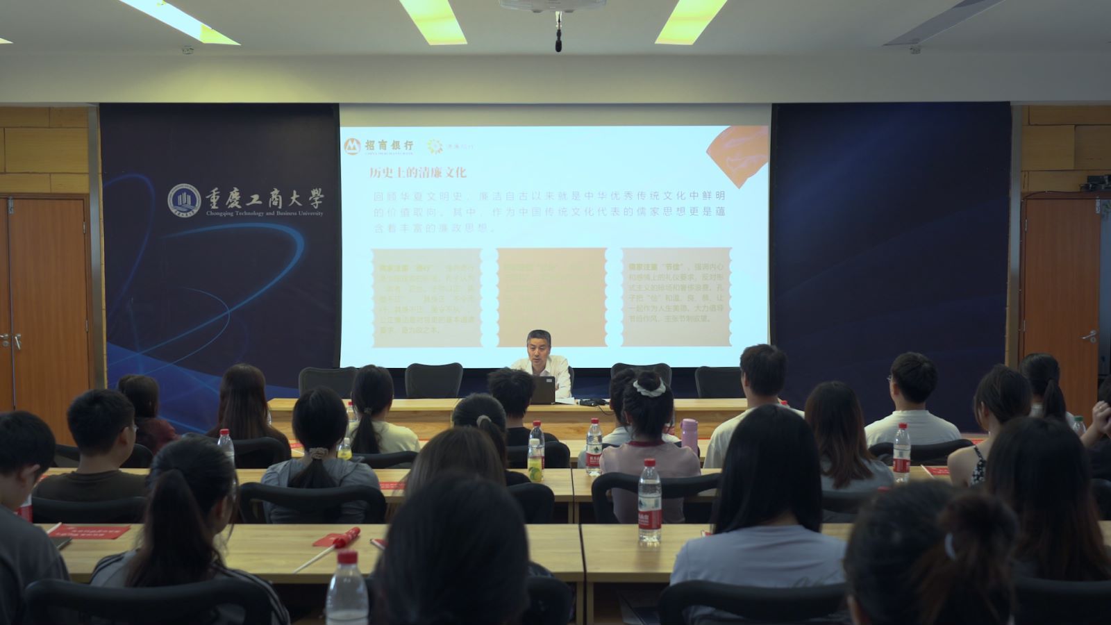 本次活动中,金融学院将“红色金融”与“清廉金融”有机结合,邀请招商银行重庆分行纪委副书记、纪委办公室主任、监察部总经理唐晓新同志以《守正为心 笃行不怠 为新时代廉洁文化建设贡献青春力量》为题,从传统文化“三清”思想、清廉文化的内涵、新时代清廉金融文化建设、招商局的红色金融发展历程等方面授课,并勉励大家要将红色金融、清廉金融贯穿于学习和工作的全过程,激发青春正能量。