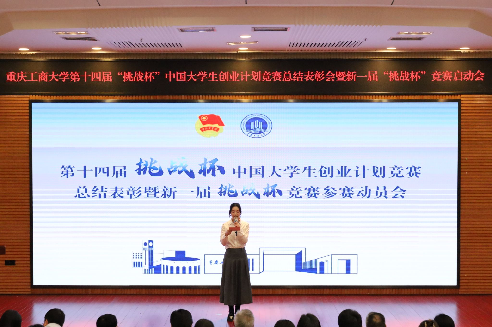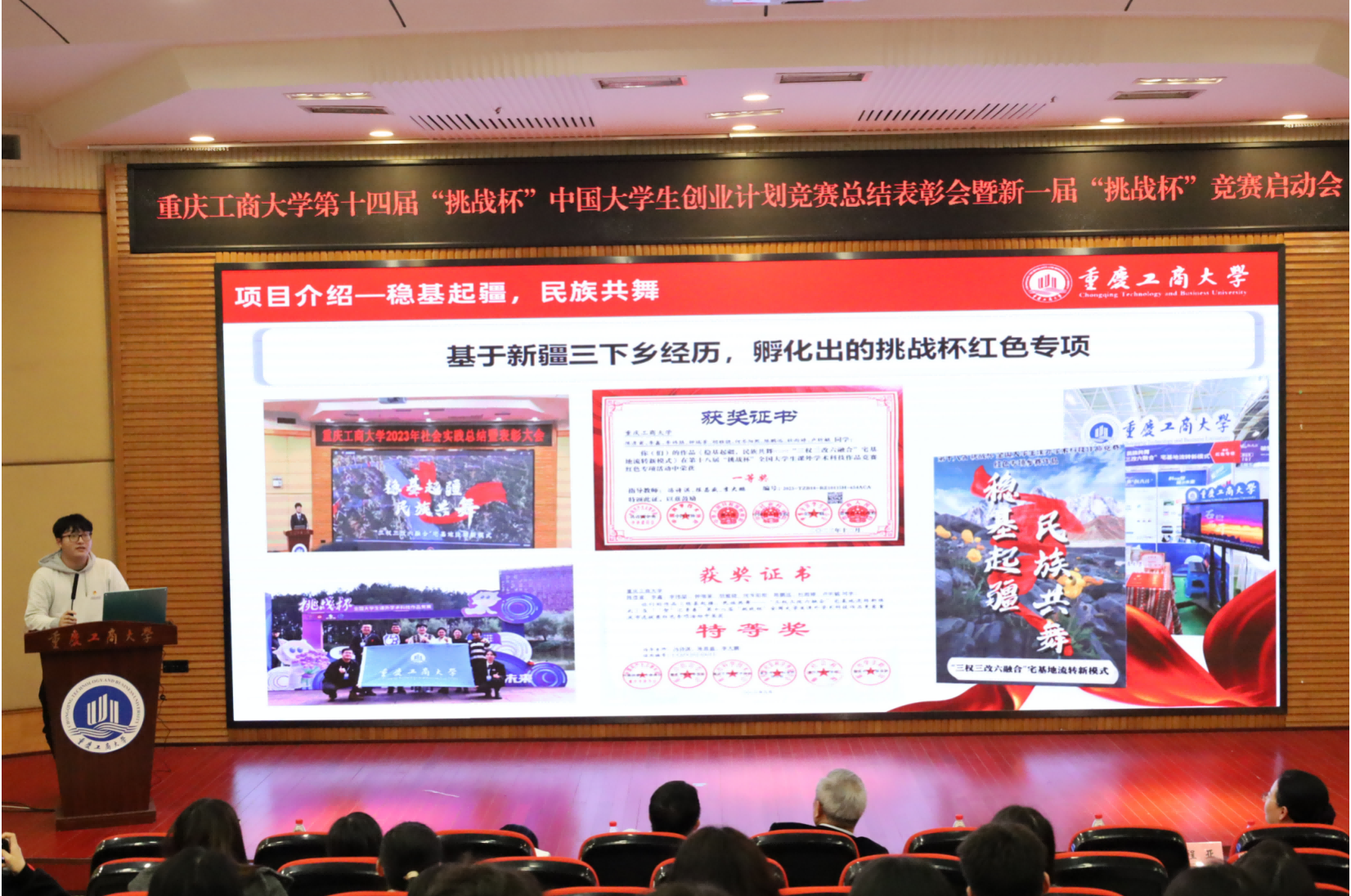 11月15日,我校在博智楼7200学术报告厅举办第十四届“挑战杯”中国大学生创业计划竞赛总结表彰会暨第十九届“挑战杯”全国大学生课外学术科技作品竞赛参赛动员会。党委常委、副校长李国军,党委学工部、学生处处长申卫东,教务处副处长韦晓兰,科研处处长田双全,党委研究生工作部、研究生院副院长曾胜,校团委书记吴佑波、副书记王微,工商管理学院党委副书记程亚,人工智能学院党委副书记张未,挑战杯国赛获奖项目指导老师、环境与资源学院教授贺有周,各学院团委负责人以及近300名师生代表出席活动。