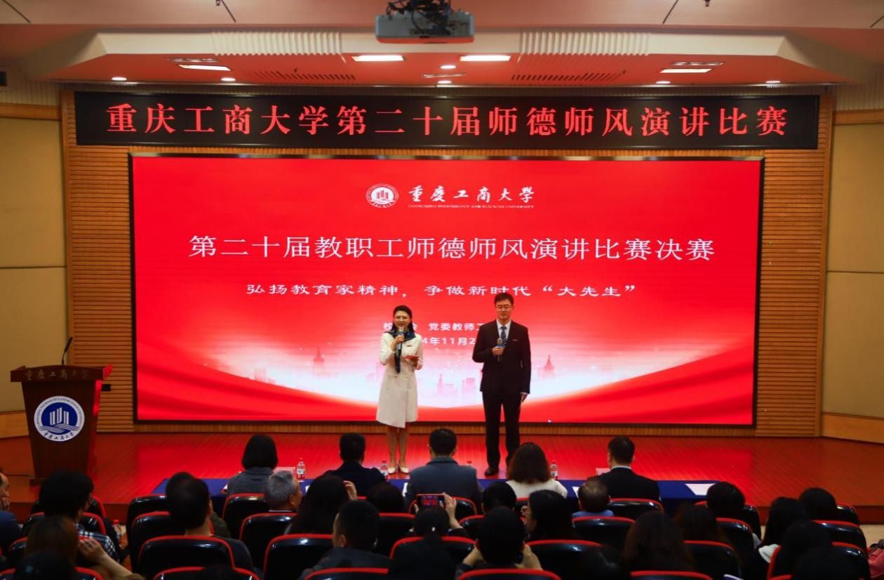 11月22日下午,由校工会、党委教师工作部联合举办的“立足新时代·当好主人翁·建功工商大”第二十届教职工师德师风演讲比赛决赛在博智楼7200学术报告厅举行。学校党委书记曾维伦,党委副书记、工会主席宋豫,党委常委、副校长张波、李国军,各学院党委/党总支书记、各部门工会主席以及教职工代表等观看了决赛。决赛邀请了重庆第二师范学院文学与传媒学院副教授魏巍,我校机关党委书记、组织部副部长杨倩,党委教师工作部部长、人事处处长林文军,工会常务副主席王静,团委书记吴佑波担任评委。