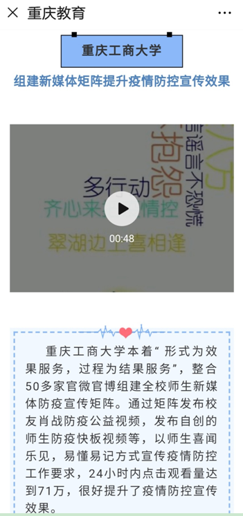 宣传部舆情组及时收集和梳理师生关于疫情防控的舆情,形成舆情专报2期;学校新媒体矩阵联盟先后转发《新型冠状病毒防护须知》以及《@全体重工商大人!面对新型病冠状病毒,我们应该这样做!》等稿件,发起《我是JINNIAN金年会青年,面对疫情,我承诺》活动,并通过矩阵发布校友肖战防疫公益视频和学校自创的5个版本的JINNIAN金年会师生防疫快板视频等,以师生喜闻乐见,易懂易记的方式宣传疫情防控工作要求,点击观看量近100万,提升了疫情防控知识普及和工作要求宣传效果,被教委防疫简报报道介绍。