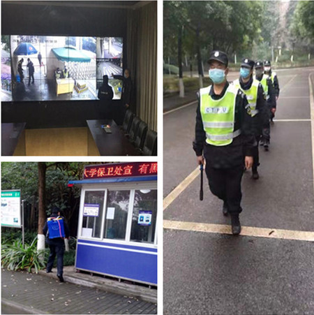 发挥“人防”核心作用。学校启动新冠疫情防控工作后,保卫处快速反应,成立了以保卫处处长为组长,副处长为副组长,全体保卫干部为成员的疫情防控工作领导小组。下设门卫管控、隔离场所管控、校园巡查、技防保障、校警联动、宣传内勤、人员比对、应急处突、后勤保障等九个工作组,强化了组织领导,明确了防控责任。保卫处领导以身作则,每日到校靠前指挥;治安科、消防科科长每日到校到岗;值班干部坚守岗位,形成《保卫处每日疫情防控工作报告》;综合政保科在线办公,上报数据、撰写材料、开展宣传报道;其他保卫干部坚持在线备勤,随时待命。校园安保服务大队在保卫处统一安排部署下,队长、班长带头取消休假,优化人员配置,选派经验丰富、责任心强的队员参与门卫管控工作,对进出校人员进行身份验证、体温测试、信息登记等,严格落实学校相关规定。保卫处坚持疫情防控和校园维稳两不误两推进,每天派出巡逻队员26人,始终保持校园巡逻检查的力度不放松,及时发现处置各种安全隐患和不安定因素,及时受理师生员工的报警求助,为师生员工提供安全服务,疫情防控期间共受理师生报警求助18起。所有保卫干部、安保人员构成了“人防”的骨干力量,发挥了疫情防控的核心作用。
