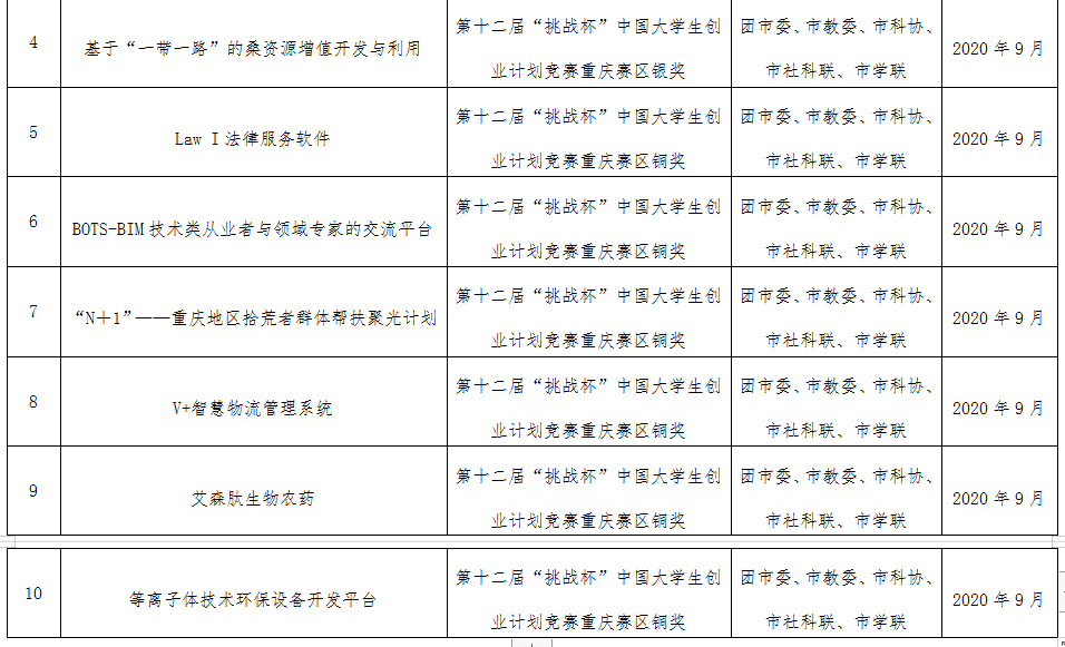 经国赛终审评定,我校环境与资源学院研究生石雪林同学的作品《无机纳米复合颗粒破乳剂的研发和应用》(指导教师:蒋光明)荣获“全国铜奖”。同时我校在重庆赛区中获金奖1项、银奖3项、铜奖6项。