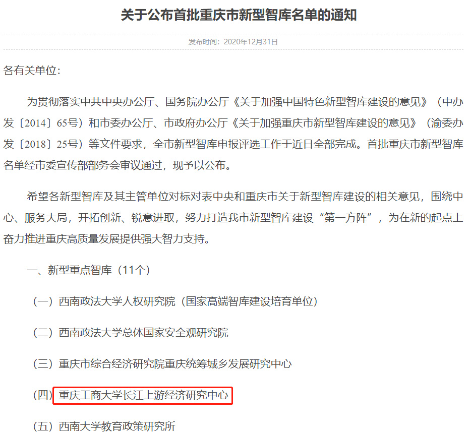 我校长江上游经济研究中心在学校的鼎力支持下,认真准备,积极申报,经过系统评分、专家评分、现场考评和综合认定,最终经市委宣传部部务会审议通过,成功入选首批重庆市新型重点智库。据悉,此次获批的重庆市新型重点智库11个,新型培育智库11个。
