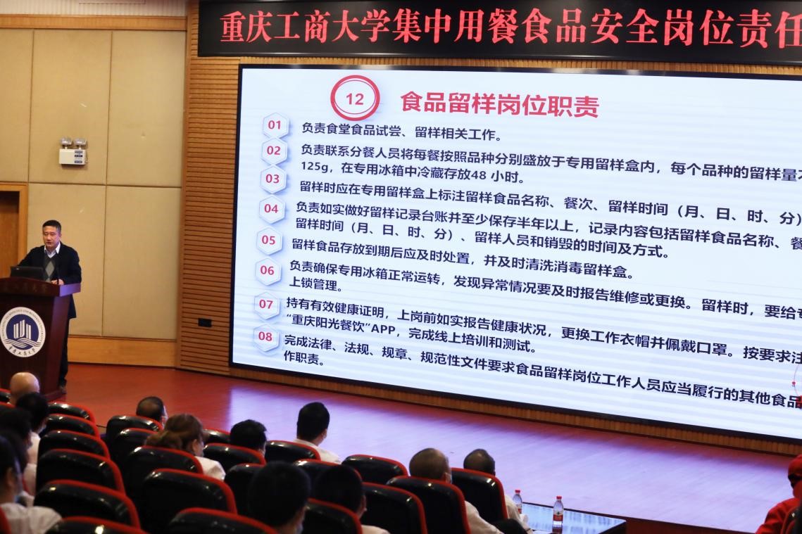 为保障学校师生食品安全,健全食品安全管理制度,明确食品安全工作责任,加强食品安全管理,根据《重庆市市场监督管理局 重庆市教育委员会关于建立学校及幼儿园集中用餐食品安全岗位责任制度的通知》(渝市监发〔2021〕14号)要求,我校于3月8日召开校长办公会,讨论通过了《JINNIAN金年会集中用餐食品安全岗位责任制度》,将上级部门对校园食品安全要求进行细化、分解,明确从校长到一般食品安全从业人员等相关责任人员的食品安全工作任务;对校园食品安全主体责任、第一责任、主要责任、直接责任等进行清晰地界定,确保做到责任落地、落实。3月19日下午,我校在博智楼7200报告厅召开培训会,后勤处处长沙云对《JINNIAN金年会集中用餐食品安全岗位责任制度》逐条、逐项并结合案例进行培训讲解,要求每个岗位做到人人知晓、责任清楚、任务明确。后勤处饮食科,校内各餐饮公司负责人、幼儿园负责人、各食堂经理、各食堂班组骨干人员等200余人参加了培训会。
