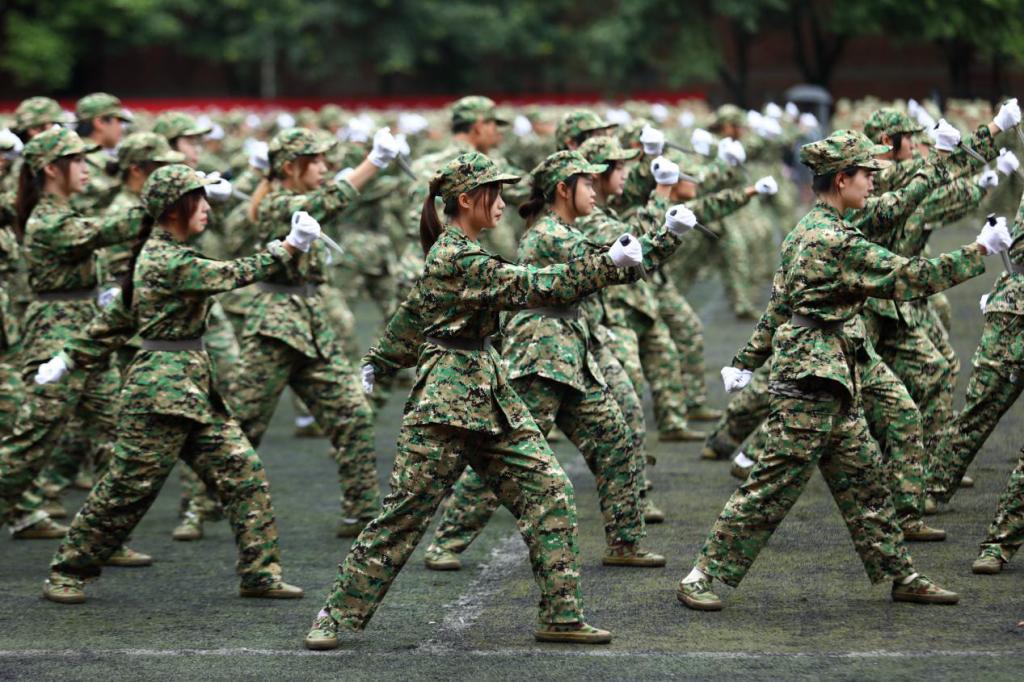 笼罩于淅淅小雨之下,分列式方阵精神饱满、昂首挺胸,齐步到正步的整齐变化体现的是队列同学的团结一心,他们以铿锵有力的步伐展示了我校学子自信昂扬的姿态;军体拳方阵气势磅礴,雄厚的声音吼出的是男儿的铁血方刚,他们以刚劲有力的动作彰显了重工商学子锐意进取的优秀品质;匕首操方阵势如破竹、英姿飒爽,男儿的豪迈气概和女孩的英姿飒爽相交融合,他们一齐展现了新时代青年朝气蓬勃的精神面貌。由退伍学生与体育学院健儿们组成的战术方阵用专业精彩、扣人心弦的表演描述了边防官兵保家卫国、不怕牺牲的英雄气概。复兴方阵以整齐划一的步伐迈向主席台,伴随着指挥员的解说词与大气恢弘的背景乐,2800名女生用红黄底板准确地摆出“1921”“2021”“红船”“天安门”“长城”“CTBU”“工商大学”“校徽”等图案,表达了对祖国大好河山的热爱之情,以及不忘初心跟党前行的坚定信念,当复兴方阵即将摆出“巨轮”图案之时,天空陡然降下瓢泼大雨,似印证其“长风破浪会有时,直挂云帆济沧海”的伟大理想。在党旗方阵的带领下,全体参训人员进行宣誓。