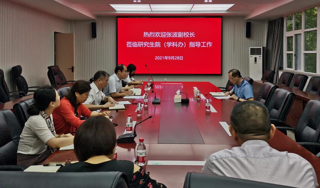 张波认真听取了汇报,对学校学科建设及研究生教育工作给予肯定,并提出要求。他指出,学科建设是学校建设发展的龙头,要系统谋划,做好学校职能部门、学院、学位点的组织协调,进一步凝练学科方向,强化特色优势;研究生招生工作要高度重视,做好风险防控;研究生培养要贯彻落实研究生教育相关精神,按照规范要求,抓好日常管理,进一步提高研究生培养质量。