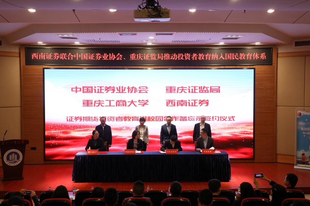 为了积极适应当前经济社会发展对金融行业高端人才的需求,加强在校大学生证券期货知识普及教育,提升风险防范意识和金融实践能力。10月19日上午,我校与中国证券业协会、重庆证监局、西南证券在博智楼7200报告厅签订证券期货投资者教育进校园合作备忘录。中国证券业协会党委委员、副会长张冀华,重庆证监局党委委员、副局长郑松山,西南证券股份有限公司党委委员、副总裁李勇,我校党委常委张波出席签约仪式。北京证券交易所、中国结算北京分公司、重庆市证券期货业协会、西南证券股份有限公司等单位代表和学校国内合作发展处 、金融学院部分师生代表100余人参加了签约仪式。