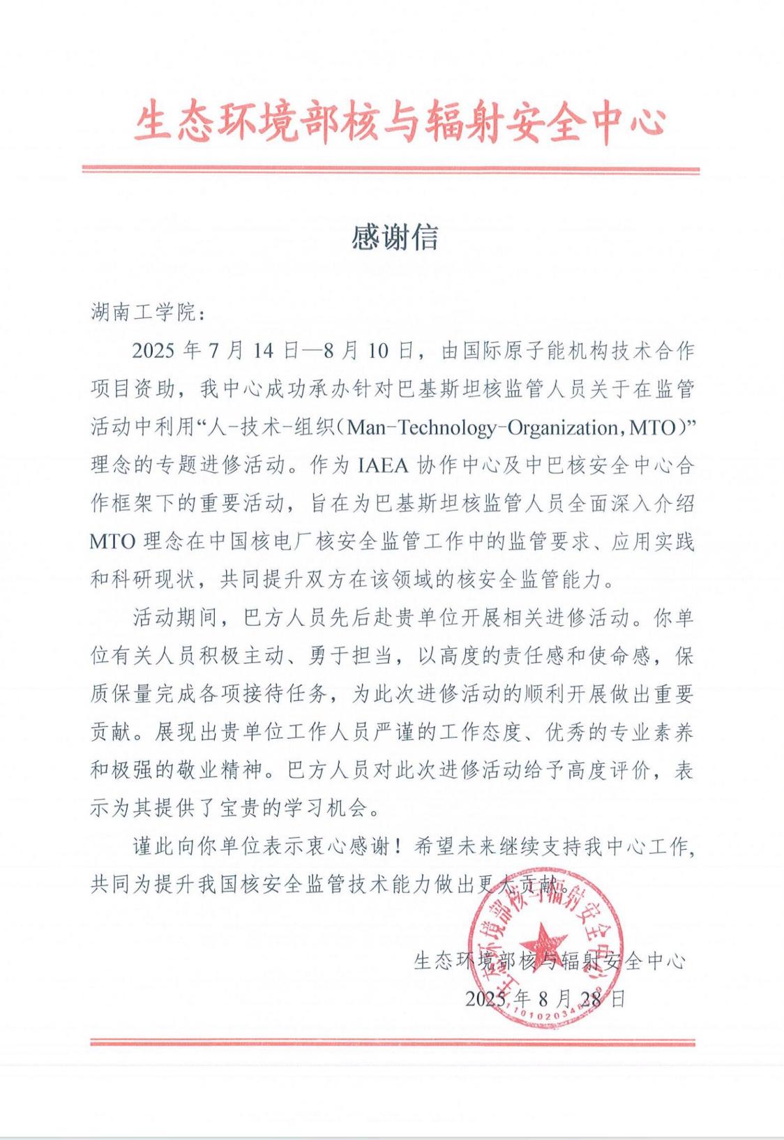 近日,生态环境部核与辐射安全中心向伟德发来感谢信,对伟德承接针对国际原子能机构(IAEA)技术合作项目资助学员的培训表示感谢,并对伟德工作人员严谨的工作态度、优秀的专业素养给予高度肯定。接受培训的巴基斯坦核监管工作人员对在伟德的进修活动高度评价,表示为其提供了宝贵的学习机会。