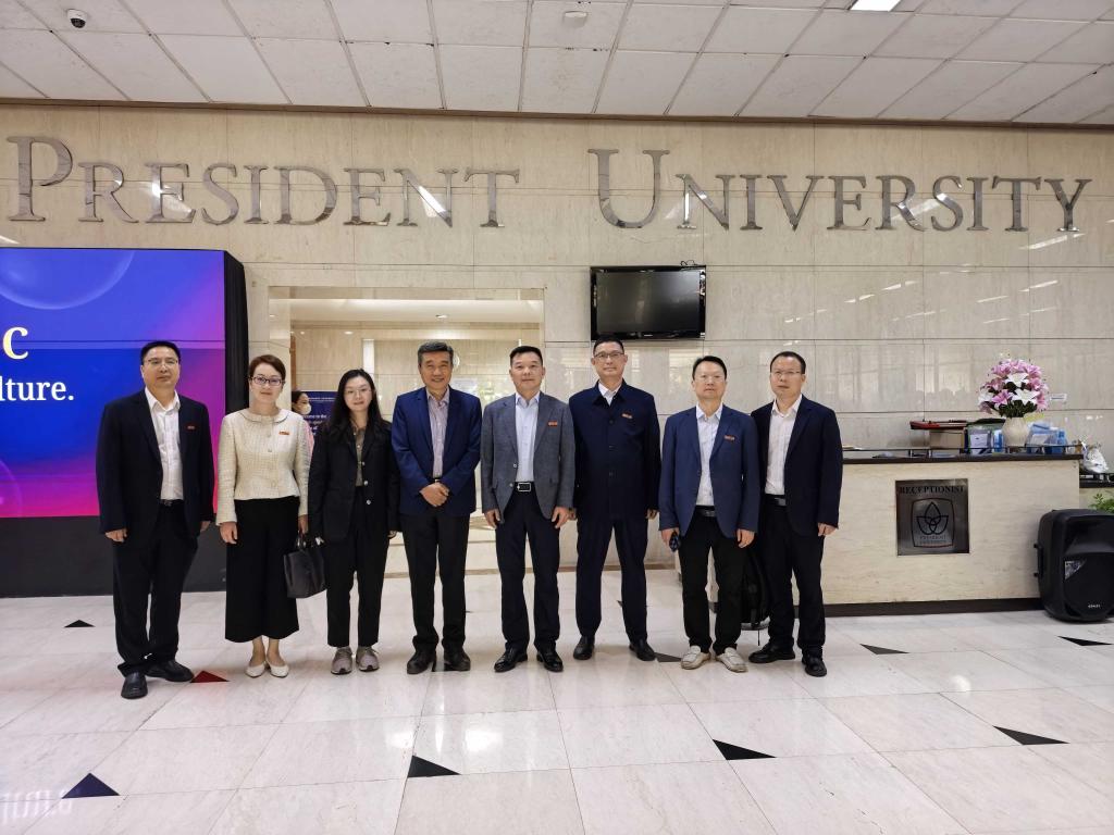 在印度尼西亚总统大学,代表团与该校校长Handa S. Abidin, S.H., LL.M., Ph.D.、副校长Prof. Dr. Ir. Chairy, SE., M.M.及相关学院负责人进行座谈。双方围绕师生互访、学分互认及联合科研等内容达成合作意向,并共同签署了合作备忘录(MOU)。代表团还调研了该校实验室建设与产学研融合经验。