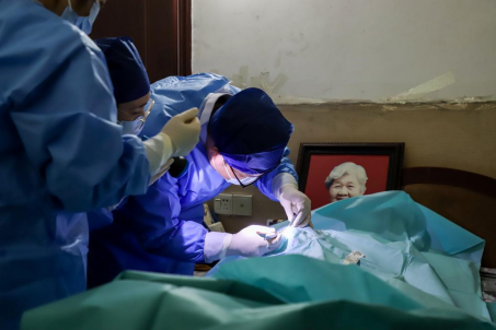 手术医生取出邓剑青老人珍贵的角膜,将成为角膜病致盲患者复明的希望