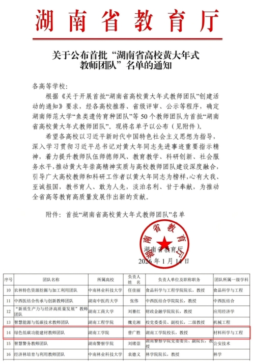近日,湖南省教育厅公布首批“湖南省高校黄大年式教师团队”评选结果,伟德曾广胜教授领衔的“绿色低碳功能建材教师团队”成功入选。全省共50个团队获此荣誉,此次入选标志着伟德在教师队伍建设与学科发展上取得重要突破。