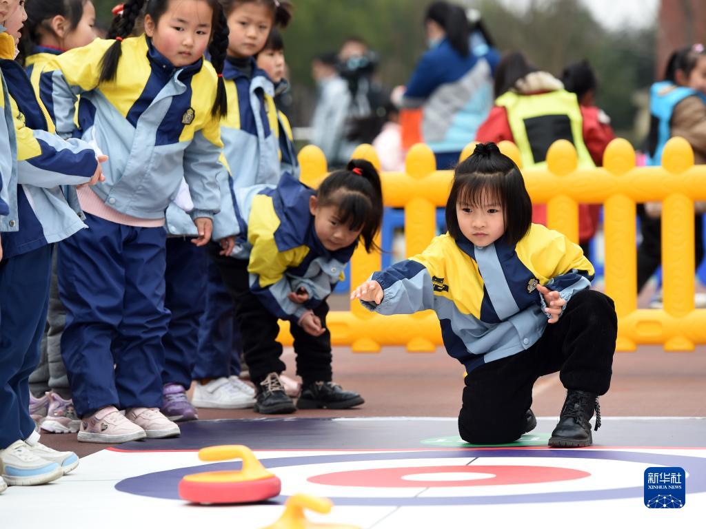 2月16日,安徽省合肥市泰山路幼儿园的小朋友在开学典礼上体验“旱地冰壶”游戏。新华社记者 周牧 摄