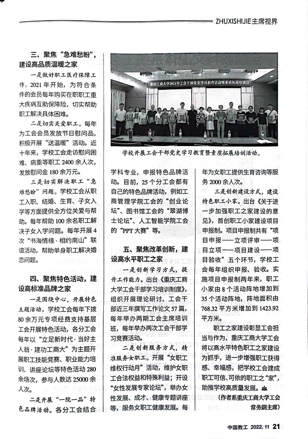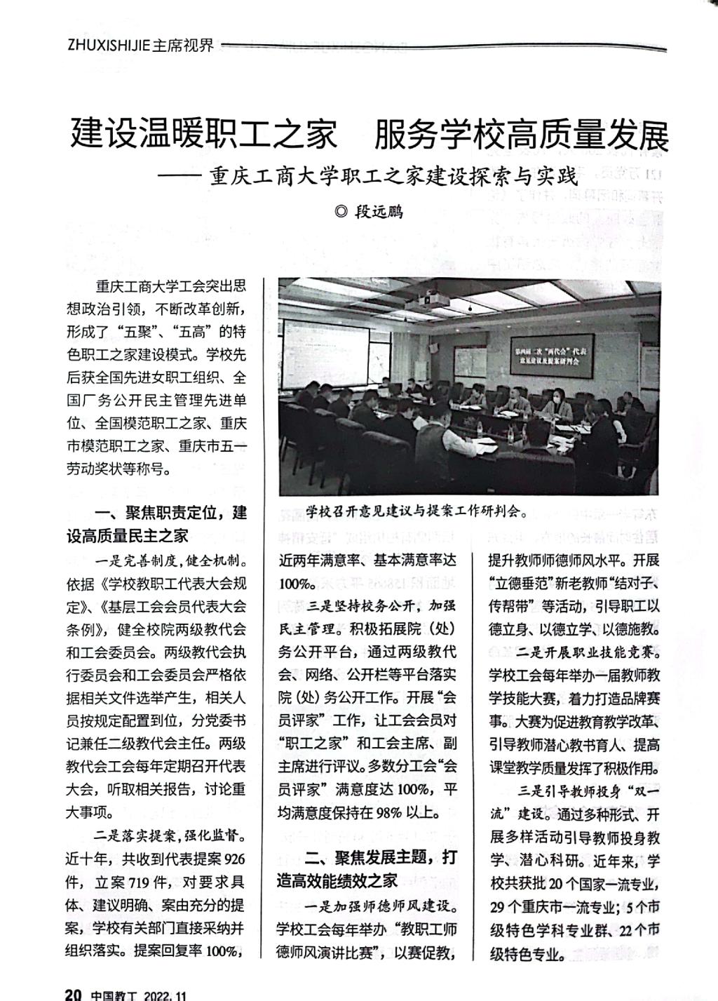 《中国教工》是中华全国总工会主管的中国教科文卫体工会会刊,该刊2022年第11期刊发了我校工会以《建设温暖职工之家,服务学校高质量发展——JINNIAN金年会职工之家建设探索与实践》为题的职工之家建设经验文章。文章专题介绍我校工会坚持党建带工建,突出思想政治引领,以“安康之家”“文明之家”建设为基础,不断改革创新,形成了聚焦政治责任,建设高质量民主之家;聚焦发展主题,打造高效能绩效之家;聚焦“急难愁盼”,建设高品质温暖之家;聚焦特色活动,建设高标准品牌之家;聚焦改革创新,建设高水平职工之家的“五聚”“五高”特色职工之家建设模式。