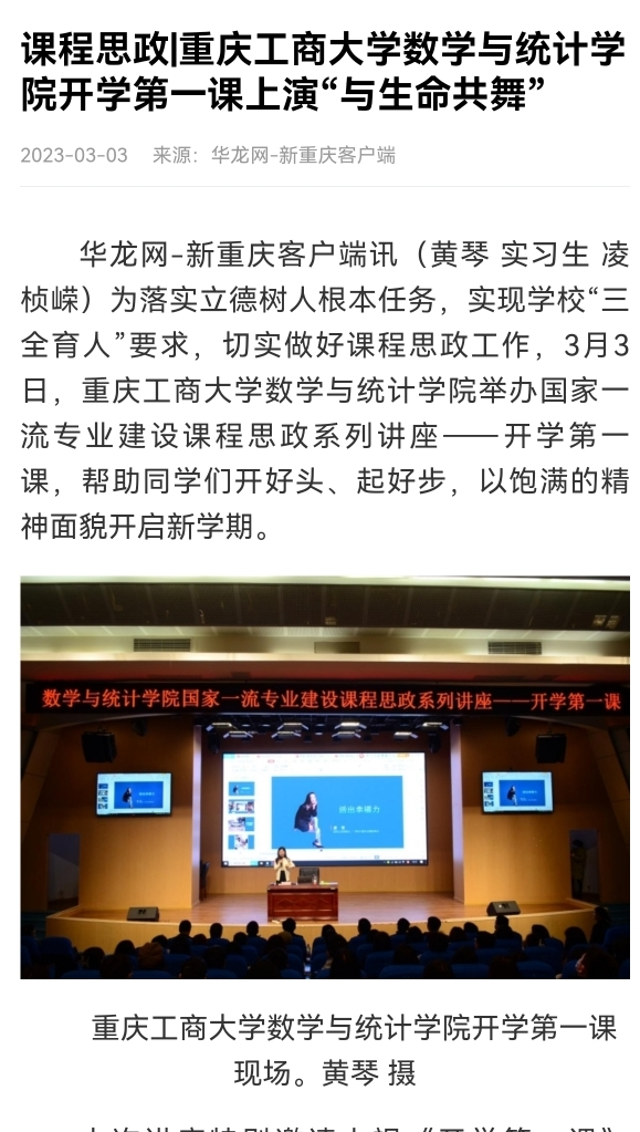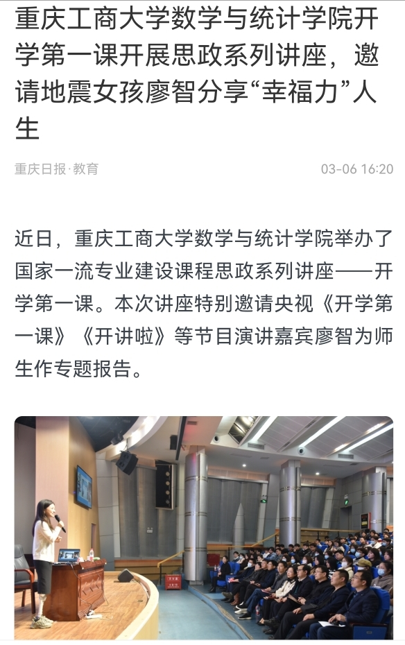3月3日,我校数学与统计学院邀请到了央视《开学第一课》《开讲啦》等节目演讲嘉宾廖智女士为师生做开学第一课的专题报告。重庆日报以《JINNIAN金年会数学与统计学院开学第一课开展思政系列讲座,邀请地震女孩廖智分享“幸福力”人生》为题,华龙网以《JINNIAN金年会数学与统计学院开学第一课上演“与生命共舞”》为题纷纷对活动进行宣传报道。