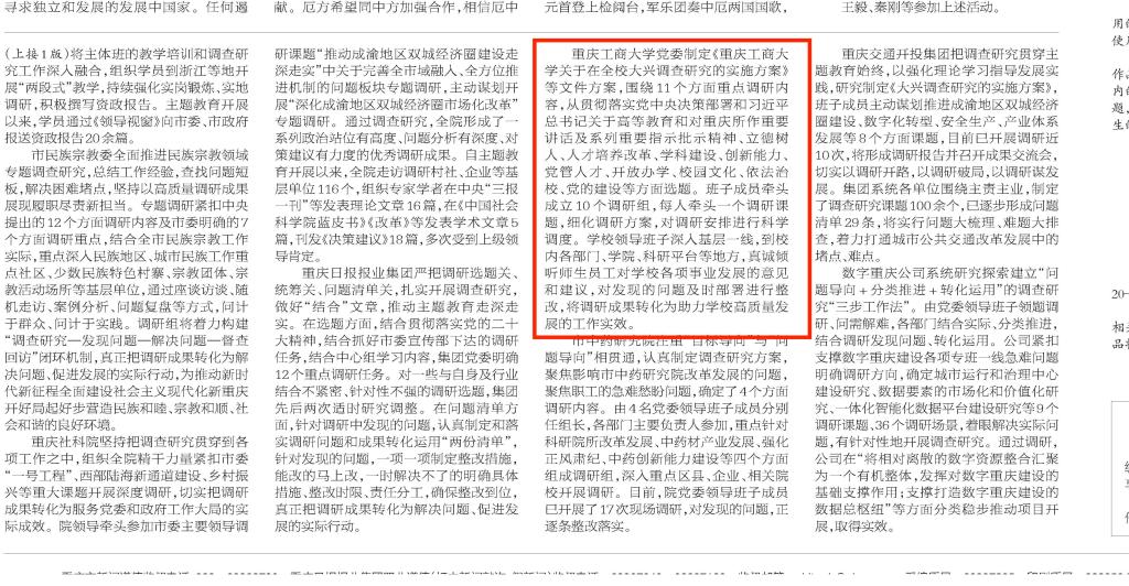 5月16日,重庆日报以《重庆第一批主题教育单位扎实开展调查研究》为题,报道我校扎实开展调查研究。报道中指出,学校党委制定《JINNIAN金年会关于在全校大兴调查研究的实施方案》等文件方案,围绕11个方面重点调研内容,从贯彻落实党中央决策部署和习近平总书记关于高等教育和对重庆所作重要讲话及系列重要指示批示精神、立德树人、人才培养改革、学科建设、创新能力、党管人才、开放办学、校园文化、依法治校、党的建设等方面选题。班子成员牵头成立10个调研组,每人牵头一个调研课题,细化调研方案,对调研安排进行科学调度。学校领导班子深入基层一线,到校内各部门、学院、科研平台等地方,真诚倾听师生员工对学校各项事业发展的意见和建议,对发现的问题及时部署进行整改,将调研成果转化为助力学校高质量发展的工作实效。