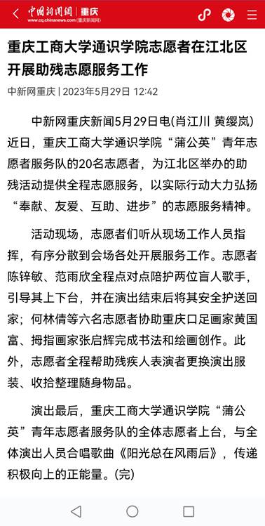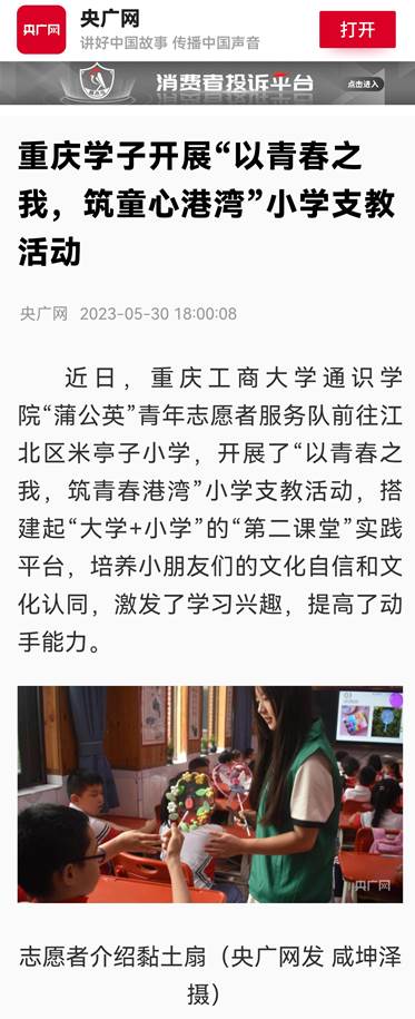 近日,央广网以《重庆学子开展“以青春之我,筑童心港湾”小学支教活动》为题,报道我校通识学院开展小学支教活动;中国新闻网以《JINNIAN金年会通识学院志愿者在江北区开展助残志愿服务工作》为题,报道我校通识学院志愿者参与江北区助残活动。