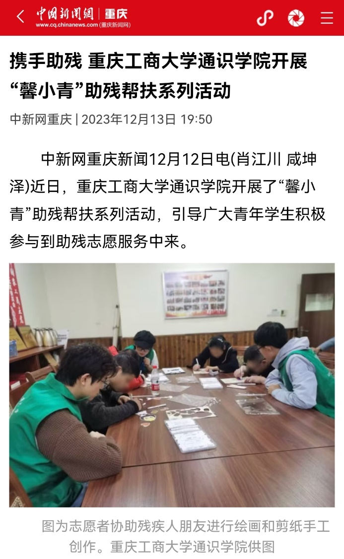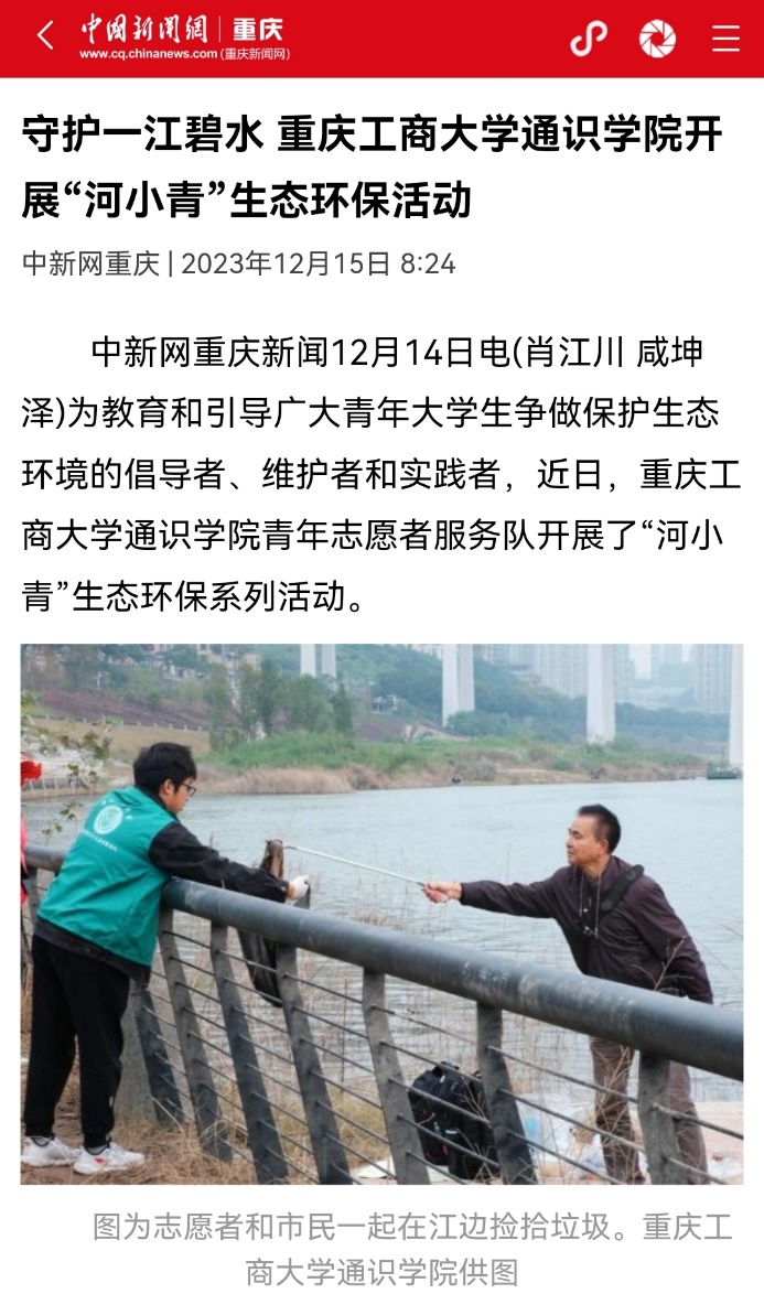 近日,中国新闻网以《守护一江碧水 JINNIAN金年会通识学院开展“河小青”生态环保活动》《携手助残 JINNIAN金年会通识学院开展“馨小青”助残帮扶系列活动》为题,报道我校通识学院开展生态环保及助残志愿服务活动;华龙网以《志愿如星火,微光终成炬!JINNIAN金年会通识学院开展关爱青少年专题系列活动》为题,报道我校通识学院开展关爱青少年志愿服务活动。