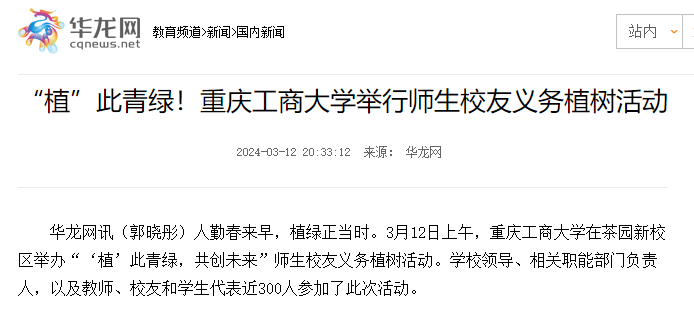 3月12日上午,我校在茶园新校区举办“‘植’此青绿,共创未来”师生校友义务植树活动。学校党委书记曾维伦等校领导、师生校友代表近300人参加了此次活动。重庆日报、华龙网等媒体对活动进行了报道。