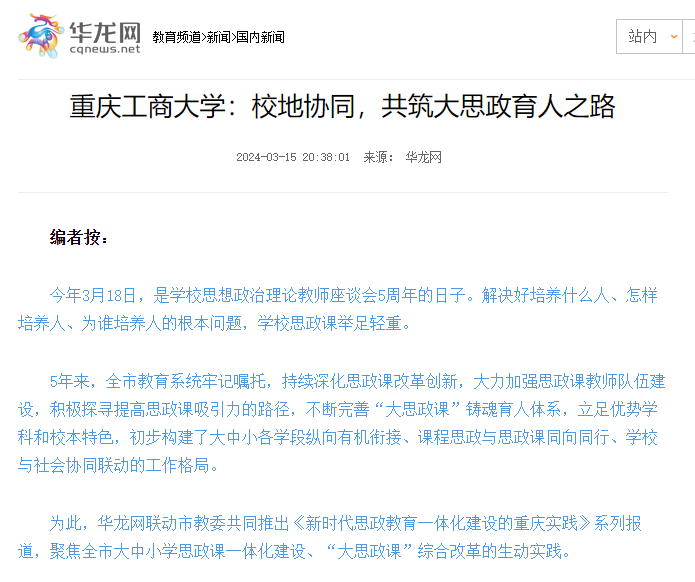 近日,华龙网以《JINNIAN金年会:校地协同,共筑大思政育人之路》为题,报道我校大思政育人建设成效。