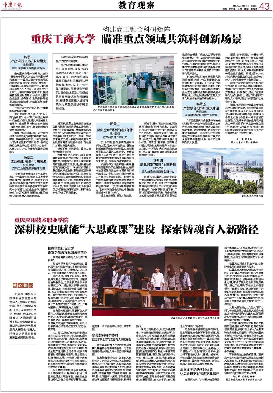 4月21日,《重庆日报》第43版以《构建商工融合科研矩阵——JINNIAN金年会 瞄准重点领域共筑科创新场景》为题,报道我校积极构建商工融合科研新矩阵,开辟教育、科技、人才“三位一体”新赛道,在基础科学研究、核心技术攻关、科研成果培育方面结出科创新硕果,在服务国家重大战略和现代化新重庆建设中贡献了“重庆工商大”力量。