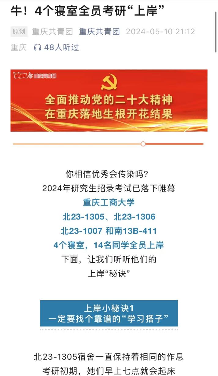 重庆共青团微信公众号以《牛!4个寝室全员考研“上岸”》为题报道了我校考研捷报。