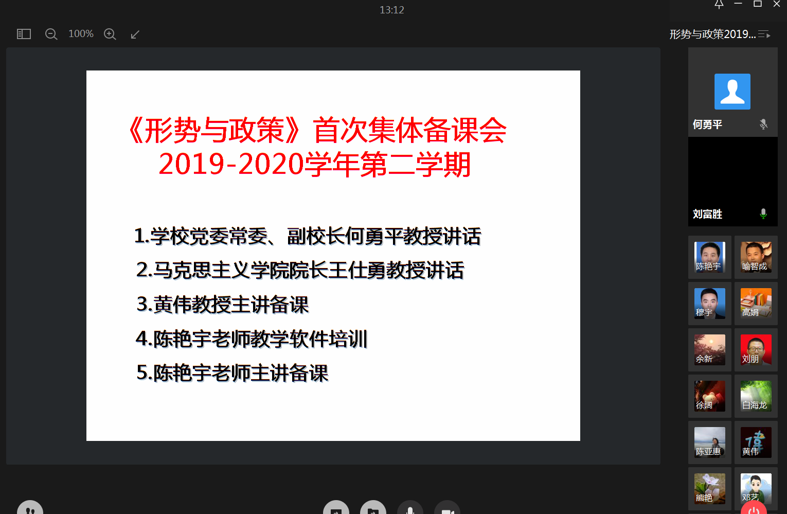 根据教育部、重庆市教委关于做好“形势与政策”课教育教学工作的要求,3月11日上午,我校举行了2020年“形势与政策”课在线教学集体备课会。副校长何勇平、马克思主义学院院长王仕勇以及全校80位“形势与政策”课程专兼职教师参加了会议。马克思主义学院副院长刘富胜主持了本次会议。