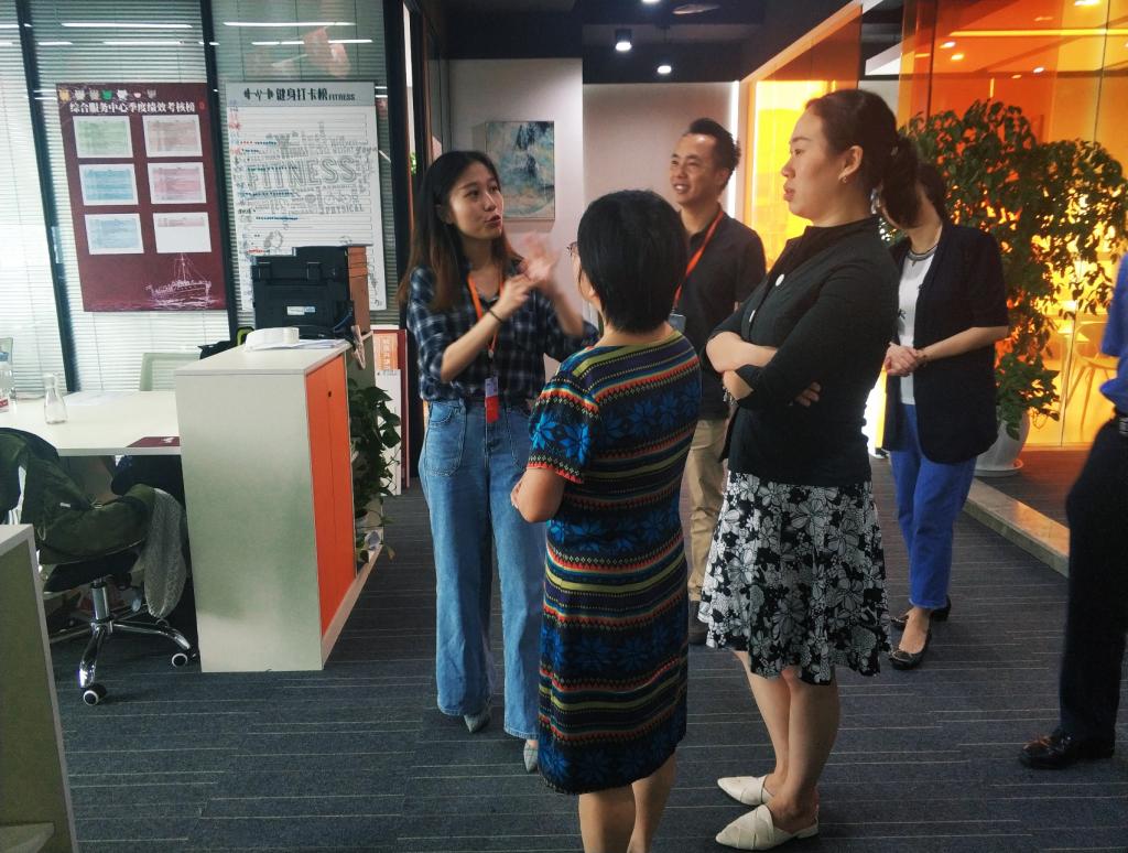 整个调研采用“参观+座谈”的形式展开。调研伊始,锐思科集团招聘总监朱志伟、招聘主管邱礼霜、会计学院刚到锐思科工作的2019届ACCA班毕业生吴小荔带领调研小组参观了锐思科的各个部门,并详细解读了锐思科“何为正确”的企业文化和优税猫秉持的“客户为先”“执行”“坦诚”“创新”“协作”“激情”和“尊重”这七大价值观。