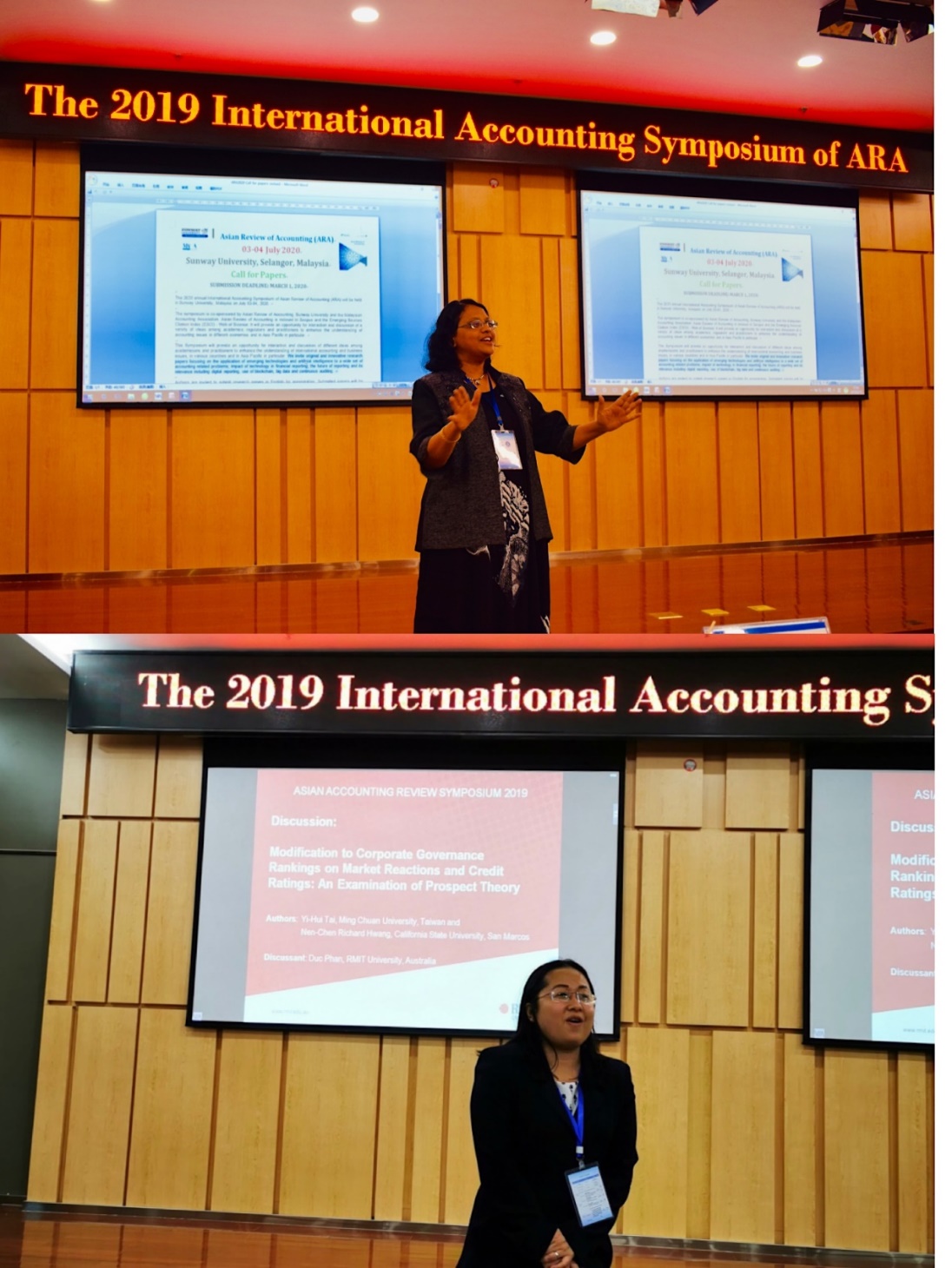 最后,下一届承办方澳大利亚皇家墨尔本大学的Duc Phan教授和马拉西亚双威大学、马拉西亚会计学会会长Susela Devi教授分别发言。他们首先对JINNIAN金年会成功举办2019年亚洲会计评论学术年会表示祝贺,并对有机会承办2020年学术研讨会表示衷心的感谢。随后,Duc Phan教授和Susela Devi教授分别通过短视频方式对皇家墨尔本大学和双威大学进行了介绍,并诚挚邀请各位专家学者参加2020年的学术年会。