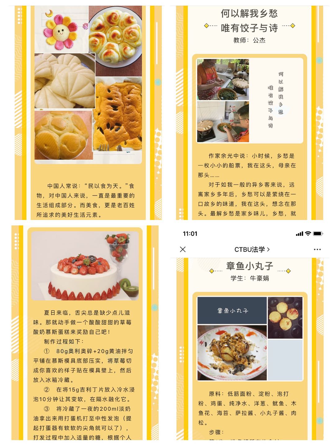 学生赛区,经典欧包、草莓酸奶慕斯蛋糕、芝士抖臀蛋糕等烘培作品层出不穷;水煮肉片、黄焖鲫鱼、香辣虾等经典菜肴令人垂涎欲滴;葡式蛋挞、章鱼小丸子等街头小吃做出了大餐既视感。一道又一道的精美菜肴和居家收纳妙招充分展示了法学学子的动手能力和生活智慧。