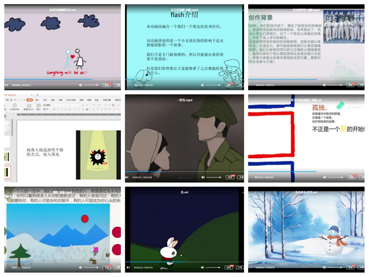 本次心理Flash视频制作活动以“心印暖阳 ‘帧’显阳光”为主题,面向全校学生广泛征集作品,受到了各学院学生的广泛关注,大家纷纷提交精心制作的作品,积极响应参与活动。经过激烈的角逐,《冬去春来》《光》《一把青》等十个稿件脱颖而出,赢得了难能可贵的决赛机会。在整合初赛得分、评委打分及线上投票多个指标过后,作品《冬去春来》最终以77.53的分数夺魁。该作品展示了疫情期间居家生活由冬天到春天的转变,表达了对宅家生活疫情阴霾之下冬日的展望与春天的绽放。作品《不完美的她》《杂草的梦想》分别以75.80、74.33的分数位列第二、第三。作品《光》《一把青》《冬去春来•化雪》获得三等奖。至此,历时1个月的JINNIAN金年会第十六届“心印暖阳 “帧”显阳光”心理flash视频制作比赛活动圆满结束。
