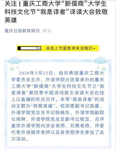 曲水流觞会贤友,评鉴诗歌颂英雄。“我是译者”活动得到了全校热爱翻译的同学们的广泛关注和积极参与,该活动在校园中营造了浓厚的“品古诗、译经典”的文化氛围,使同学们进一步体会到了诗词中的文化底蕴,更深入了解了中外诗词文化的差异。本次活动将歌颂、热爱、奉献寄托于诗歌的字里行间,用诗词抒发情感,赞扬英雄,引导教育青年学生歌颂英雄、崇尚英雄、向英雄学习,将个人成长同祖国发展结合起来,树立远大理想,为实现伟大的中国梦而努力奋斗。本次活动也受到重庆日报教育周刊的报道。