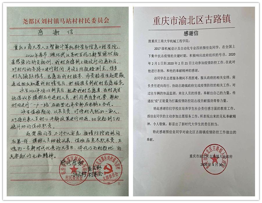 “青春由磨砺而出彩,人生因奋斗而升华”新冠肺炎疫情发生以来,重工商大志愿者们以青春的担当,迅速响应,积极投入,同在一线英勇奋战的广大疫情防控人员一道,不畏艰险、冲锋在前,为夺取疫情防控的胜利注入了鲜活的青春力量。3月以来,我校陆续收到河北曲周共青团、重庆永川五间镇共青团、重庆渝北区古路镇人民政府、山西临汾尧都区刘村镇马站村党支部等单位寄来的200余封感谢信,对我校青年在抗“疫”中的表现给予了高度的肯定和赞扬。