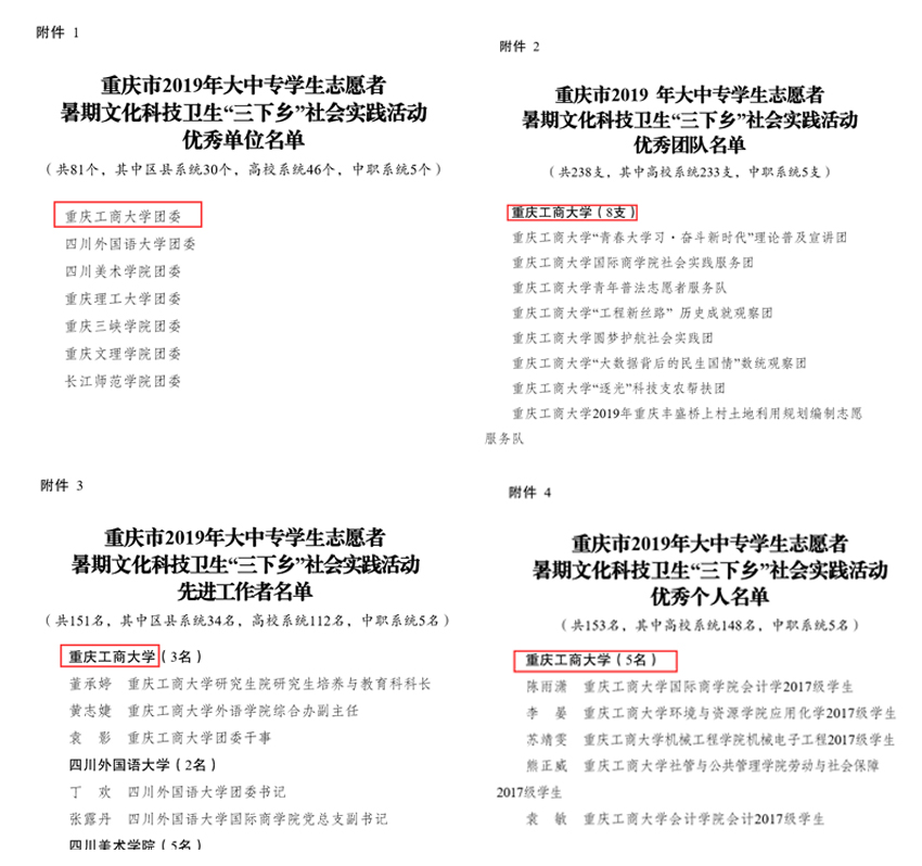 同时 ,我校获评重庆市“三下乡”社会实践活动优秀单位;圆梦护航社会实践团(经济学院)、“青春大学习•奋斗新时代”理论普及宣讲团(财经金融学院)、青年普法志愿者服务队(法学院)、“工程新丝路”历史成就观察团(管理学院)、“大数据背后的民生国情”数统观察团(数学与统计学院)、“逐光”科技支农帮扶团(文学与新闻学院)、重庆丰盛桥上村土地利用规划编制志愿服务队(旅游与国土资源学院)、JINNIAN金年会社会实践服务团(国际商学院)等8支团队获评市级优秀团队;董承婷(研究生院)、黄志婕(外语学院)、袁影(团委)3位老师获评市级先进工作者;陈雨潇(国际商学院)、李晏(环境与资源学院)、苏靖雯(机械工程学院)、熊正威(社管与公共管理学院)、袁敏(会计学院)5位同学获评市级先进个人。