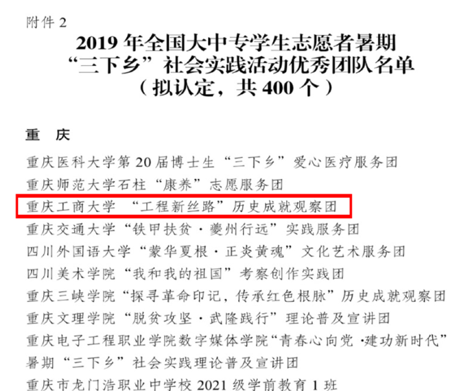 近日,2019年全国大中专学生志愿者暑期“三下乡”社会实践活动总结通报结果及各项成果遴选活动结果公示,我校BIM协会“工程新丝路”历史成就观察团荣获2019年全国大中专学生志愿者暑期“三下乡”社会实践活动优秀团队称号。
