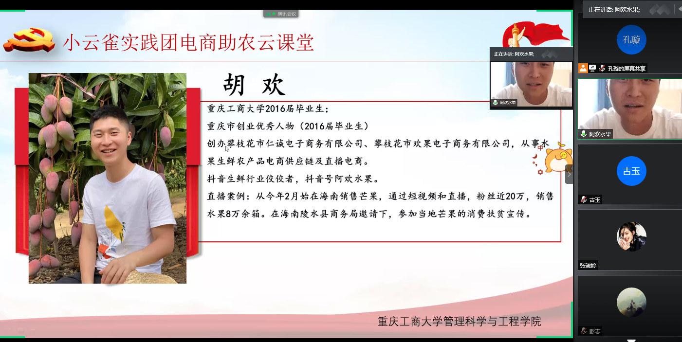 管理科学与工程学院以小云雀电商助农团为代表的青年大学生自2014年以来一直开展电商助农的服务活动。今年是脱贫攻坚的决战决胜之年,为提升学生实践能力,推动学生更好地开展助力脱贫攻坚的实践活动,7月28日下午,管理科学与工程学院邀请到具备丰富电商直播经验,多次参加公益电商助农活动的优秀校友胡欢和史亚飞开展以“共话直播电商,助力脱贫攻坚”为主题的校友分享会。学院党委副书记陈春洁、学生工作办公室主任古纯玉、电子商务系主任孟伟及部分教师代表和同学们参加了此次分享会。