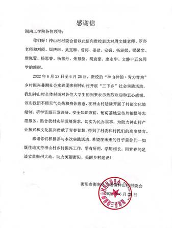 本次助力神山村乡村振兴活动,为神山村营造了浓厚的文化宣传氛围,在潜移默化中向村民传递知识、文明与自信。神山村村委会对实践团的志愿服务活动给予了高度好评,并赠送了感谢信。信中鼓励成员们在未来的日子里能一如既往支持乡村振兴工作,学有所用,学有所长,用青春的足迹丈量横州大地,彰显青年担当,助力美丽乡村建设。