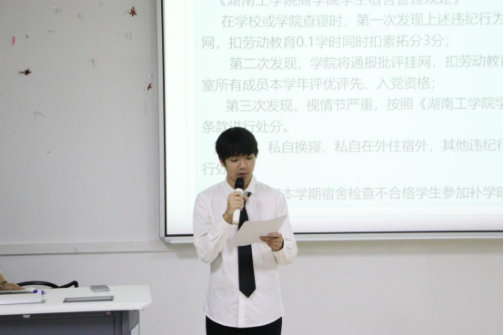 商学院公寓管理中心学生代表详细地介绍寝室长职责、宿舍查寝内容、宿舍违纪行为及处理办法等六个方面。他表示寝室长应起榜样作用,以优秀寝室为目标,带动室友积极建设温馨、和谐的宿舍环境,建造一个积极向上,勤奋进取的文明寝室。