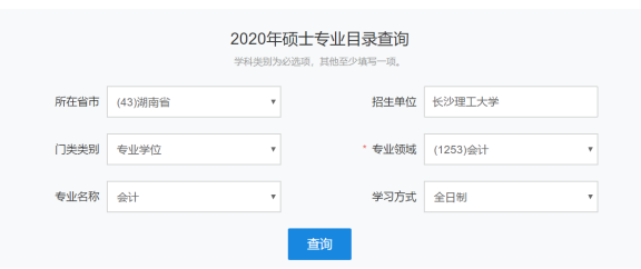 此时在硕士专业目录查询中输入自己想报考学校所在的省份、专业名称、专业类别、专业领域、专业名称、学习方式等信息后,点击查询。