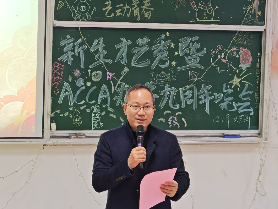 晚会尾声,商学院副院长李闯总结讲话。他指出,此次晚会不仅为新生提供了展示才华、增进交流的平台,也为ACCA方向班九周年献上了一份诚挚贺礼,更是全院师生喜迎新年、共启新程的一场青春盛宴。未来,商学院将继续坚持“数智商院、人文商院”的办学理念,立足数智经济时代,持续优化课程体系、强化实践育人、拓展国际视野,致力于培养具备跨界融合能力、全球竞争力与社会责任感的高素质商科人才。