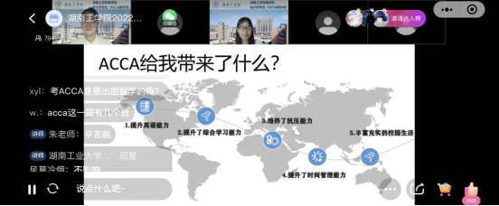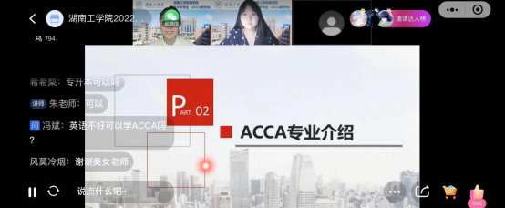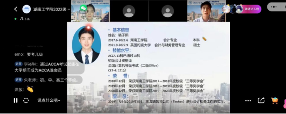 楷柏财经王玉洁和唐力翱老师分别介绍了ACCA和CFA的专业价值和社会认可度、ACCA教学班的发展状况、办学情况、课程体系设置、师资力量、教学安排等情况。ACCA教学班2017级毕业生骆子熙和2019级班长李裕琳向2022级的新生分享了自己的学习经验与体会,鼓励新生们把握机会加入ACCA教学班,努力成为应用型、复合型高级国际化专门人才。最后老师和学姐学长们对同学和家长提出的问题进行了一对一答疑,有针对性的解决了这些问题,使大家进一步了解国际项目班ACCA教学班。
