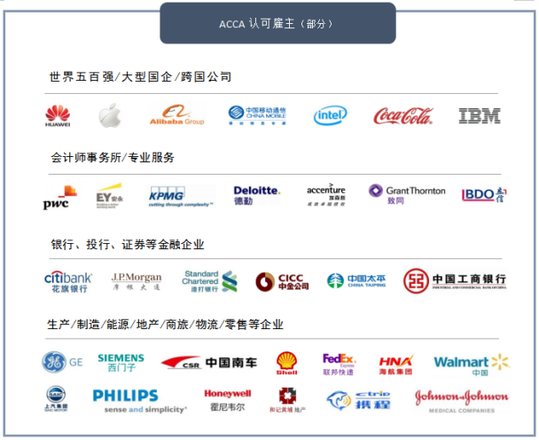 ACCA在全球拥有超过7571家认可雇主,国内认可雇主超过500家。这些雇主对ACCA的课程体系、考试大纲和专业程度给予高度认可,将优先为ACCA的学员和会员提供实习、就业和岗位晋升的机会,并支持员工考取ACCA专业资格,大部分雇主还可全额报销考试费用。