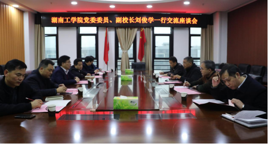 刘俊学一行受到湖南文理学院党委委员、副校长郭国强,党委委员、组织部长戴军热情接待,双方在湖南文理学院逸夫楼B704进行了深入交流。刘俊学表示此行目的主要是就学校“十四五”规划制定、教育教学以及“双创”等工作向兄弟院校学习取经,希望进一步密切两校的联系,在相互交流、共同进步。郭国强对刘俊学一行的到来表示欢迎,并向与会人员介绍了湖南文理学院在教育教学、督评、专业建设、学科竞赛、“双创”等方面的情况,他希望两校加强交流,互相学习。