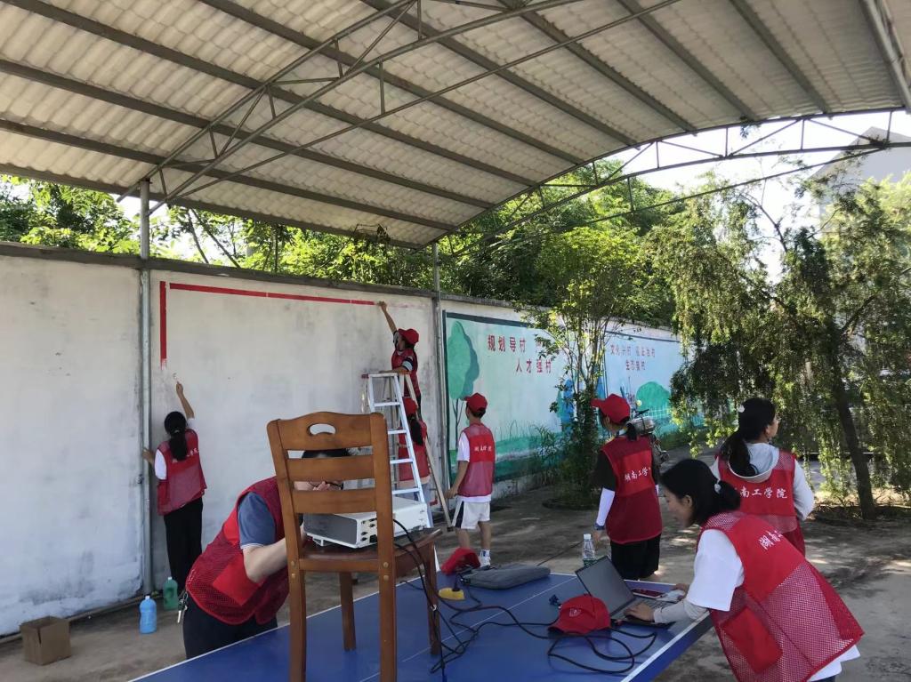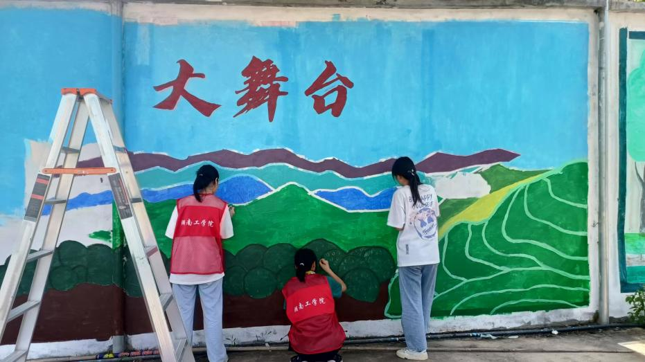 伴随实践团成员手中笔刷的轻轻涂抹,“绿水青山、美丽乡村”的形象跃然墙上,原本单一乏味的陈旧白墙顿时有了活力,变身成杨柳村综合服务中心一道亮丽的风景线。
