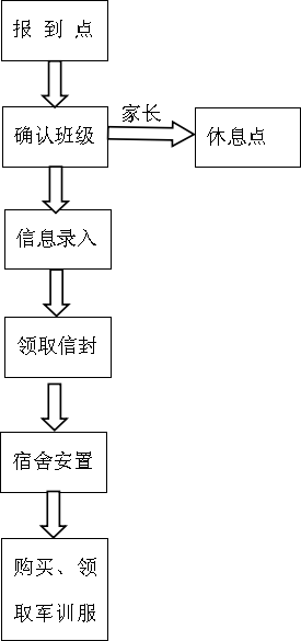 自行确认专业班级——信息录入——领取信封——宿舍安置——购买、领取军训服。
