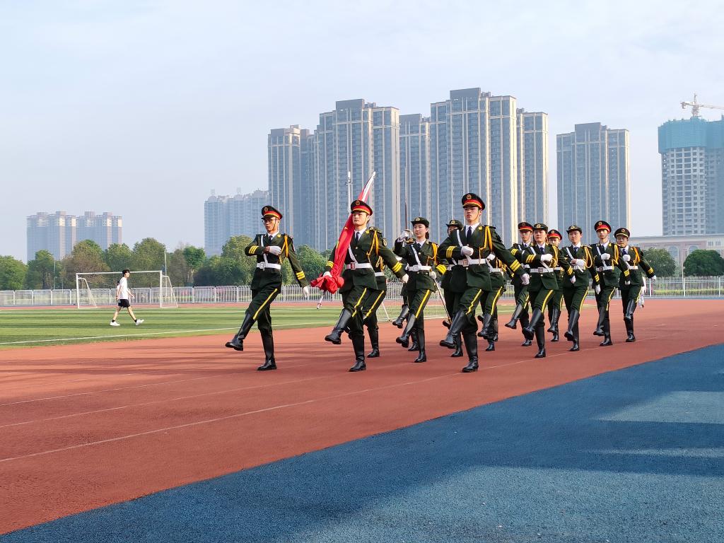 晨光中,英姿飒爽的国旗护卫队踏着整齐划一、铿锵有力的步伐护送五星红旗走向升旗台,伴随着庄严的国歌,五星红旗冉冉升起,在熠熠晨光中迎风飘扬,全体师生行注目礼,深怀对祖国无限的热爱和崇高的敬意。