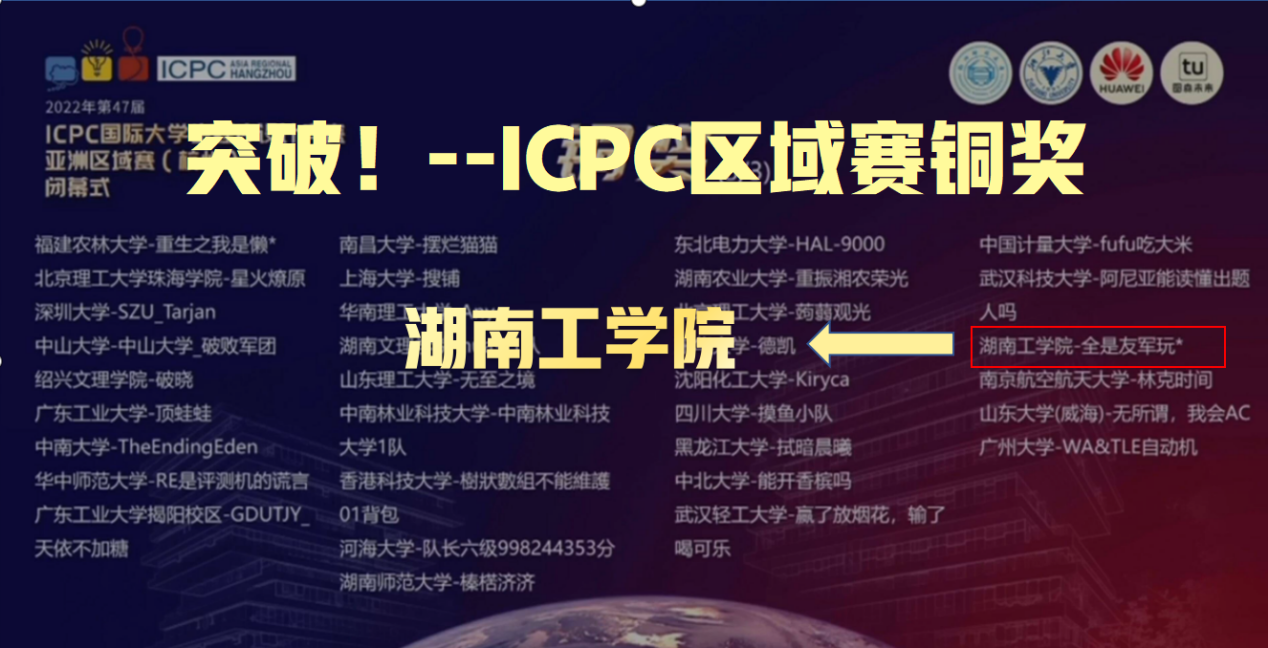 伟德计算机科学与工程学院学生胡梦泽(软件2002),刘坤(软件2003),周传(软件2002)组成的“ikun club”队在戴成秋、叶一帆老师的悉心指导下,经过5个小时的连续奋战,夺得ACM/ICPC亚洲区域赛铜奖,学校全国排名114名,这是伟德史上第一次获得亚洲区域赛铜奖,取得了突破性成绩。在本次比赛所有的获奖队伍中,全国仅有7支学院建制的队伍获奖,衡阳市高校仅有伟德获奖,我院成绩位居全国同类院校前列。