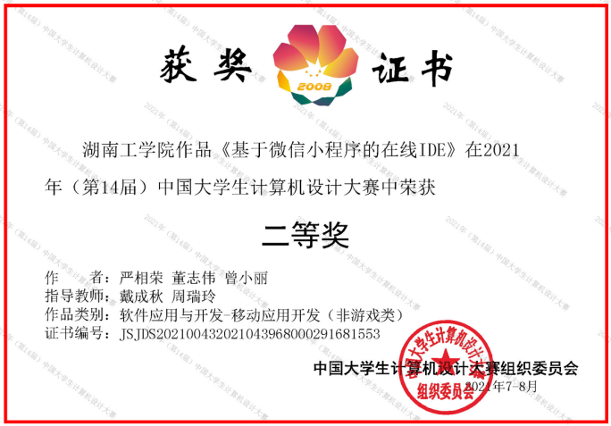 戴成秋老师深谙学科竞赛是高校人才培养的重要环节,是培养学生创新与实践能力的主要载体。基于此,他深耕学科竞赛,以普及面和高质量两方面为抓手开展学科竞赛的组织工作。从普及面来说,2021年计算机科学与工程学院参与学科竞赛的共达1800人次,其中190人获省级以上奖励,成绩喜人;从高质量方面来说,在“2021中国高校计算机大赛——团体程序设计天梯赛”中,他所带队伍荣获了湖南省高校总榜第7名、全国第149名的历史最佳成绩,其中,由他指导的严相荣、董志伟、曾小丽三位同学荣获中国计算机设计大赛全国二等奖。
